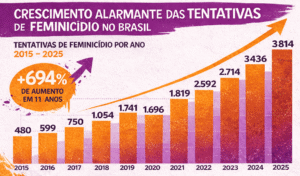 Em 2025, o país registrou 3.814 casos de tentativas de feminicídio. Uma média de 10 vítimas por dia. Em 10 anos, de 2015 – quando foram registrados 480 casos – para 2025, houve um aumento assustador de 694,58%. Ao todo, nesse período, 20.695 mulheres sofreram tentativa de feminicídio no Brasil.